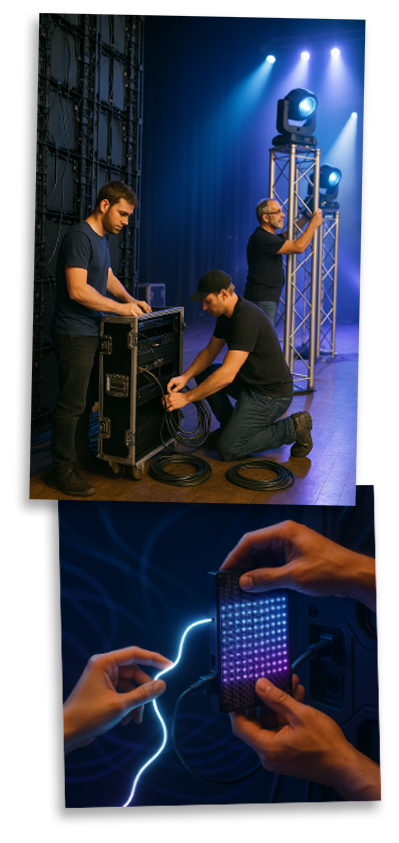 Trabalhamos com moving lights, parleds, strobes, canhões, COBs e máquinas de fumaça, sempre com projetos personalizados e controlados por especialistas.